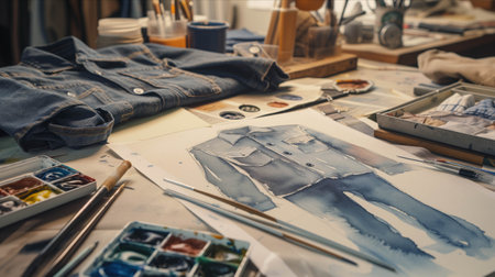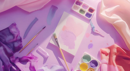 Paint brushes and paints scattered on a vibrant table, ready for a creative masterpiece to come to life.