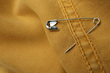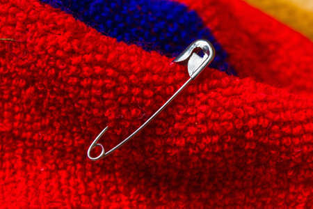 Close up view of metal safety pin on clothing