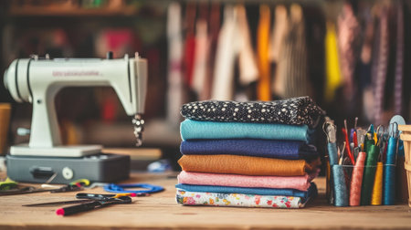 A warm and inviting sewing workshop showcasing a colorful stack of fabrics, a vintage sewing machine, and various crafting tools in a creative atmosphere to inspire artistic projects.
