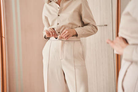 Woman trying on fashionable clothes in a shop shopping style shirt