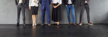 Legs of business people stand against a concrete wall for a corporate team portrait highlighting leadership and teamwork. Six professionals standing in a row in office. Teamwork concept.