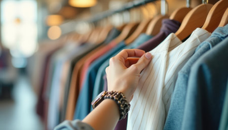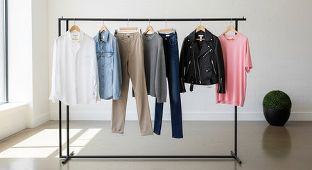 Colorful clothes hanging on hangers displayed, showcasing various styles and textures. Garments in retail shop setting. Clothes shopping and fashion.