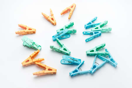 Colorful plastic clothespins on a light background. Space for your inscription. Minimalism, original and creative photography. Be different. The concept of individuality. Vertical wallpaper for a smartphone. High quality photo