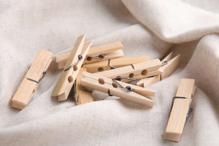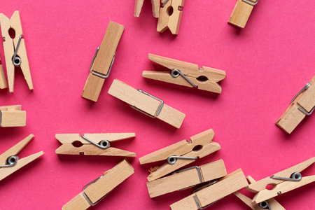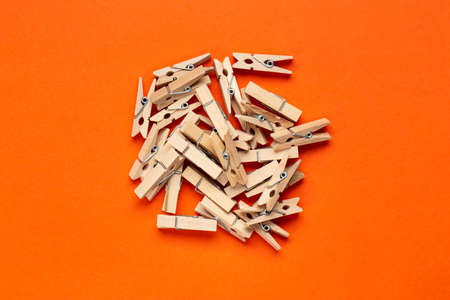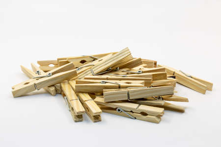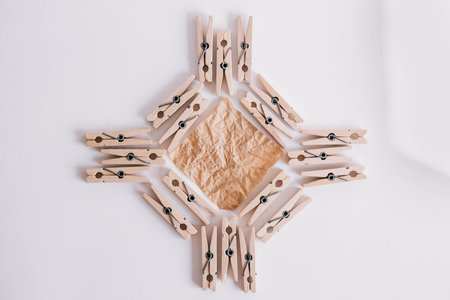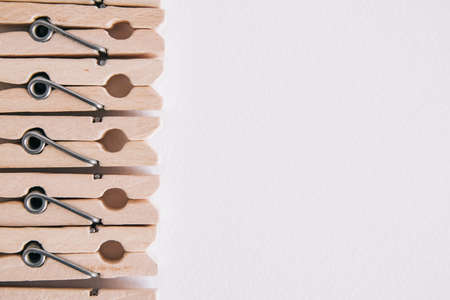 Wooden clothespins on a white background. View from above. Place for text or advertising