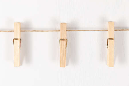three wooden clothespins with a metal spring hang on a rope on a white background. selective focus