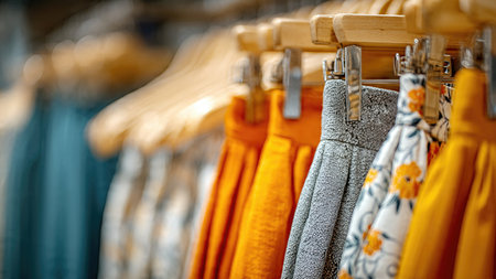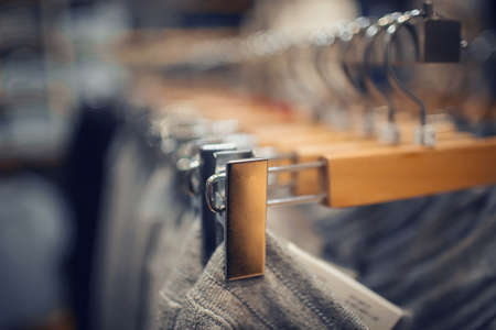 Shopping in store. Clothes on hangers in shop for sale. Blur background. Fashionable clothes in a boutique. Various clothing on market.