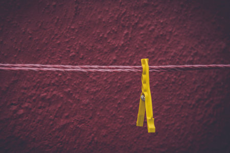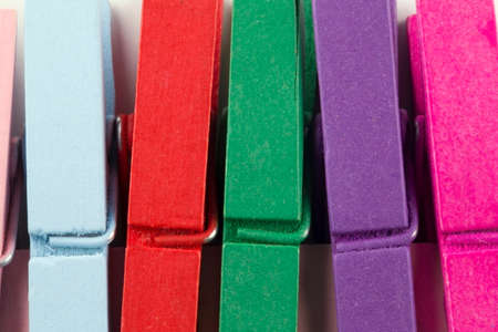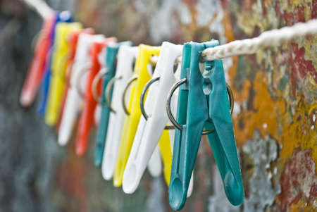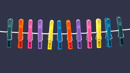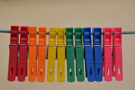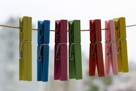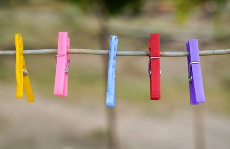 Concept colored wooden clothespins on a ropeclip wooden clothesline colorful. pink yellow.