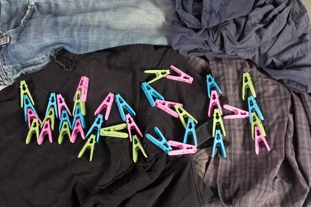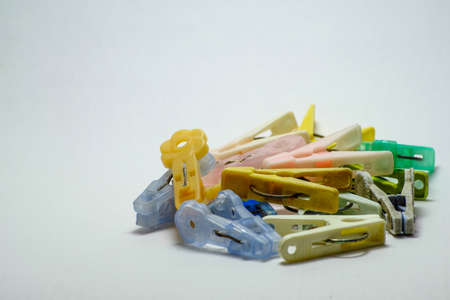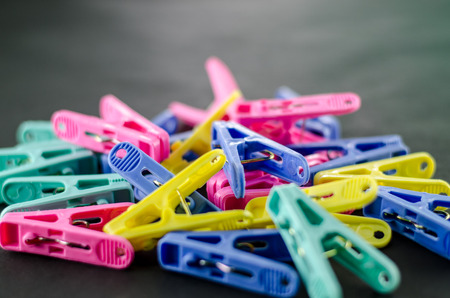 Old plastic buckles on a black countertop. Clipped very worn on a black background. Hanging laundry and laundry.