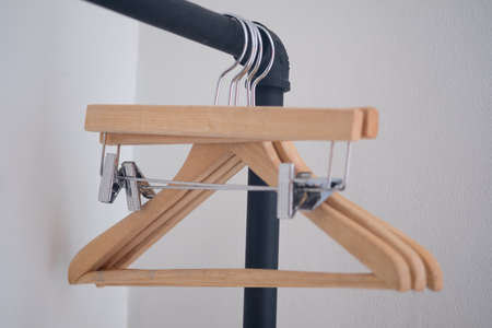 Some used clothes hanging on a rack in a flea market. Background of dress. Selective focus.