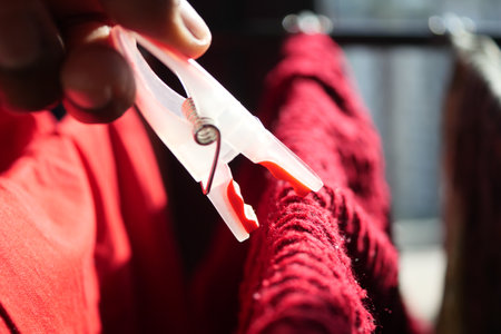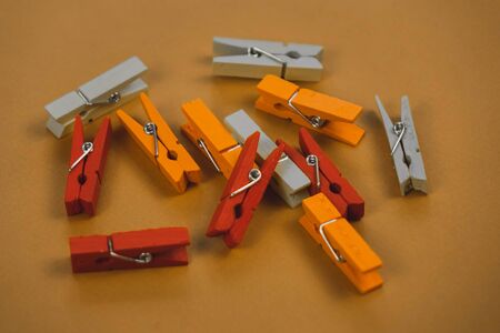 Vintage view of colorful Clothes pegs pinned to a bench with red wall in a background hanging on a clothes