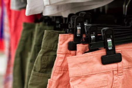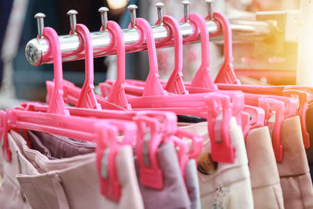 colorful trousers with hangers for sale on pink rack at shopping mall