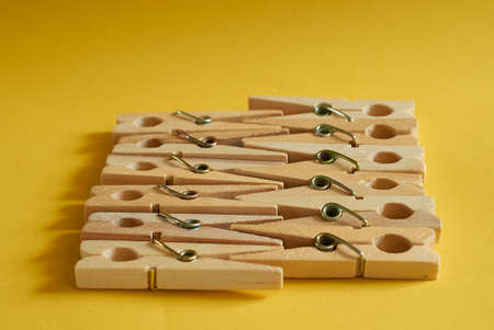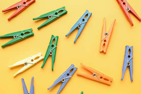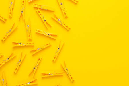 Decorative multicolored wooden clothespins on a yellow background. Flat lay composition