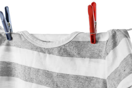 Baby t-shirt hanging on rope with clothespins against white background, closeup
