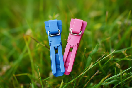 Pops of Color on Fresh Green: A Trio of Blue, Yellow, and Pink Clothes Clips