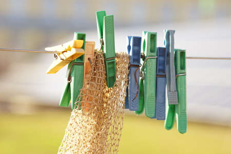 Plastic clothespins hang on a rope with a net in a sunny garden