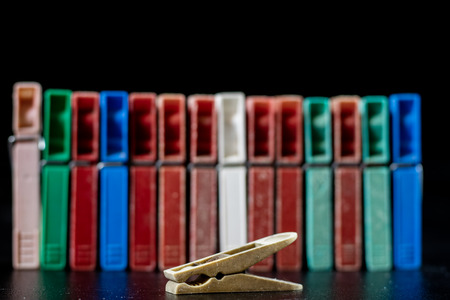 Wooden clothes pegs on a black background. Selective focus. High quality photo