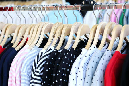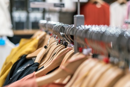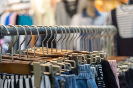 Shopping in store. Clothes on hangers in shop for sale. Blur background. Fashionable clothes in a boutique. Various clothing on market.