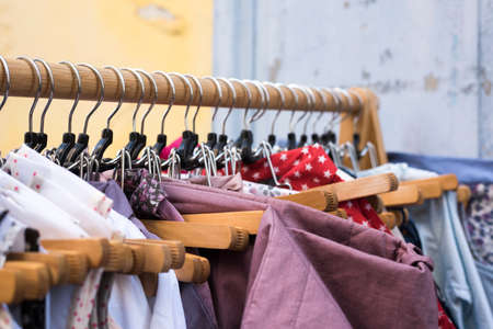 Used second hand clothes on hangers on a garment rack, as donation to a charity or for flea market sale, selected focus, narrow depth of field