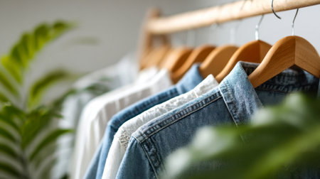 A casual wardrobe corner featuring a classic blue denim jacket and crisp white shirts on wooden hangers, softened by a lush green plant in the foreground.