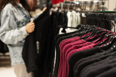 Shopping in store. Clothes on hangers in shop for sale. Blur background. Fashionable clothes in a boutique. Various clothing on market.