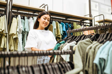 A young casual girl with a serious face dressed in a white shirt is shopping in a clothing store looking for casual