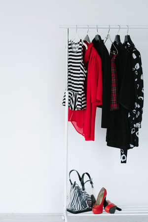 Female classic clothes and red purse. Feminine red shirt, skirt and leather wallet on white wooden background.