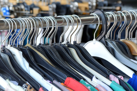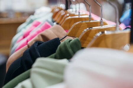 Shopping in store. Clothes on hangers in shop for sale. Blur background. Fashionable clothes in a boutique. Various clothing on market.