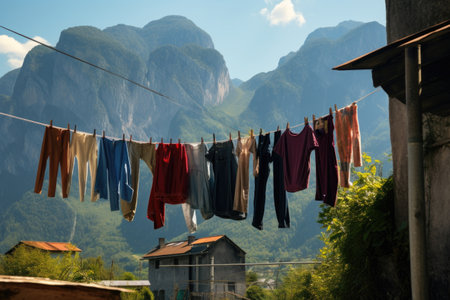 clothes drying on a line with a mountainous backdrop, created with generative ai