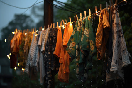 raindrops on clothes hanging in the rain outdoors, created with generative ai