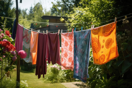 clothesline with colorful clothes, hanging in garden, created with generative ai