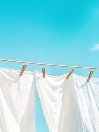 A serene image of white laundry hanging on a clothesline under a bright blue sky, conveying a sense of freshness, simplicity, and outdoor living.