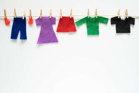 Felt clothes hanging on rope on white background. Art craft creative concept with empty space for text.