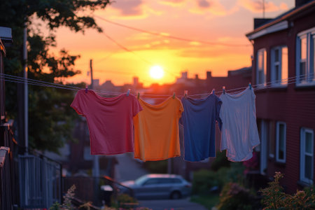 Clothes hanging on clothesline drying during beautiful sunset in residential area