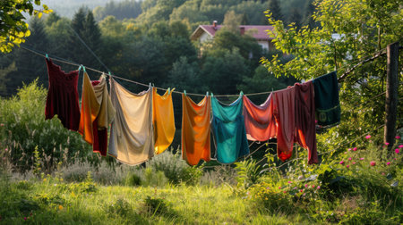 Clothes hang on a line, soaking up the sun's rays, as a gentle breeze carries the scent of freshness.