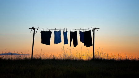 A vibrant silhouette of clothes hanging on a line at sunset, showcasing the beauty of outdoor drying. This image captures peaceful rural life in a serene setting.