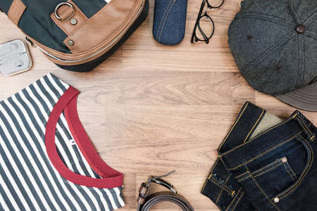 Flat lay photography of men's casual outfits, Outfits of traveler, boy, male, Men's casual outfits on wood board background