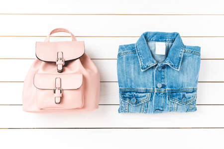 Women's backpack and jeans jacket. Top view