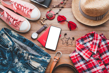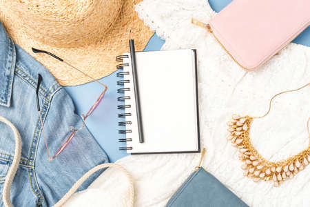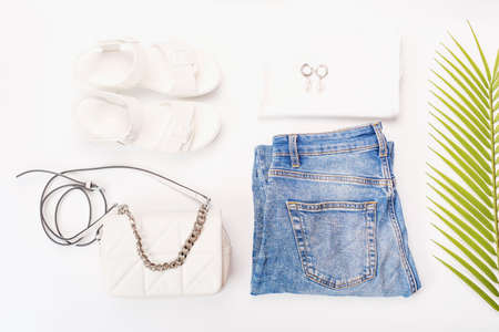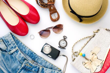 Casual spring/summer female clothing set. Vacation clothes and accessories concept.