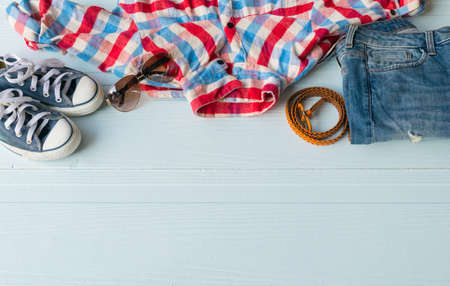 Accessories costume clothes Jeans and hats sunglasses shoes on Wooden floor background.