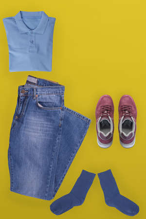 flat lay, men's fashion.blue jeans ,red sneakers,blue t-shirt,dark blue socks on yellow background. casual clothes top view