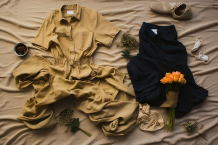 flat lay composition with female lingerie, denim shorts and sandals on beige background top view