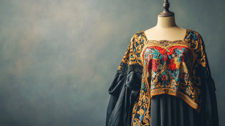 European bohemian-style dress on a mannequin, front view, no people, with ample copy space and clean background.