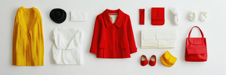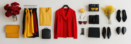 A stylish capsule wardrobe is arranged with a bold red jacket contrasting against monochrome black and yellow garments, showing minimalist elegance.