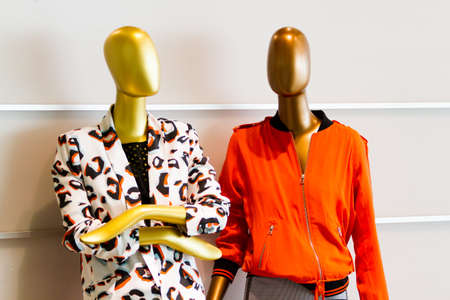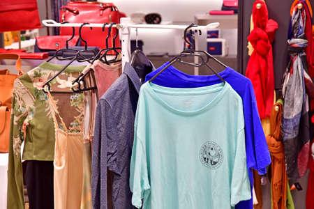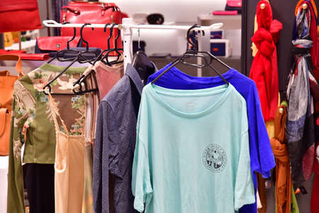 spring and summer womens clothing in the store. bright, modern clothes in a boutique. Womens hip clothing store interior concept. concept of choice of clothing. toned