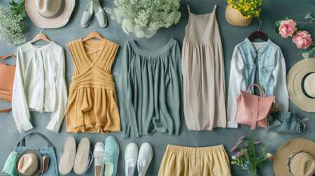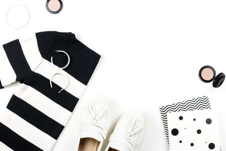 Casual style woman clothes and fashion accessories flat lay. Trendy patterns and prints concept.