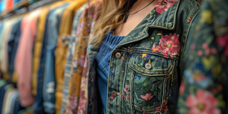Close-up of a woman wearing a stylish floral embroidered denim jacket in a boutique