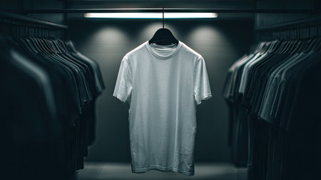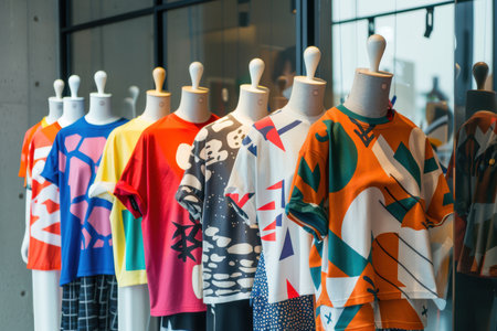 A display of various casual t-shirts on hangers, with different colors and graphic designs, arranged neatly in a retail store.