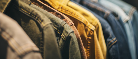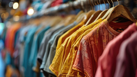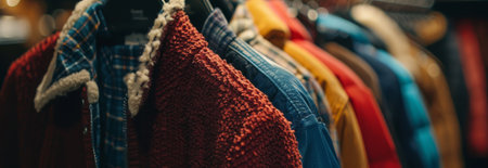 Close-up view of a boutique clothing rack with various stylish garments, textures, and vibrant colors in a trendy store. concept of fashion, clothing diversity, retail style.