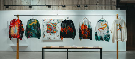An artistic crewneck mockup featuring painterly designs, displayed in an art gallery setting to attract creative minds, --ar 16:7 --v 6 Job ID: d0298db1-b8a8-4578-b104-ef68356dd0ff