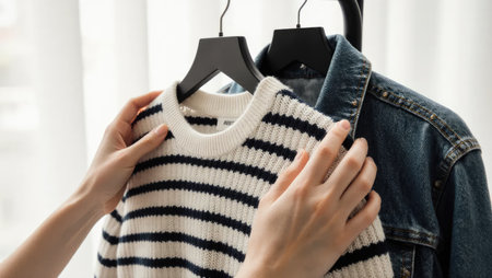 A denim jacket and a black-and-white striped shirt are casually draped over a wooden chair, illuminated by warm backlighting. The image evokes a sense of relaxed style, getting ready, or a quiet domestic moment.